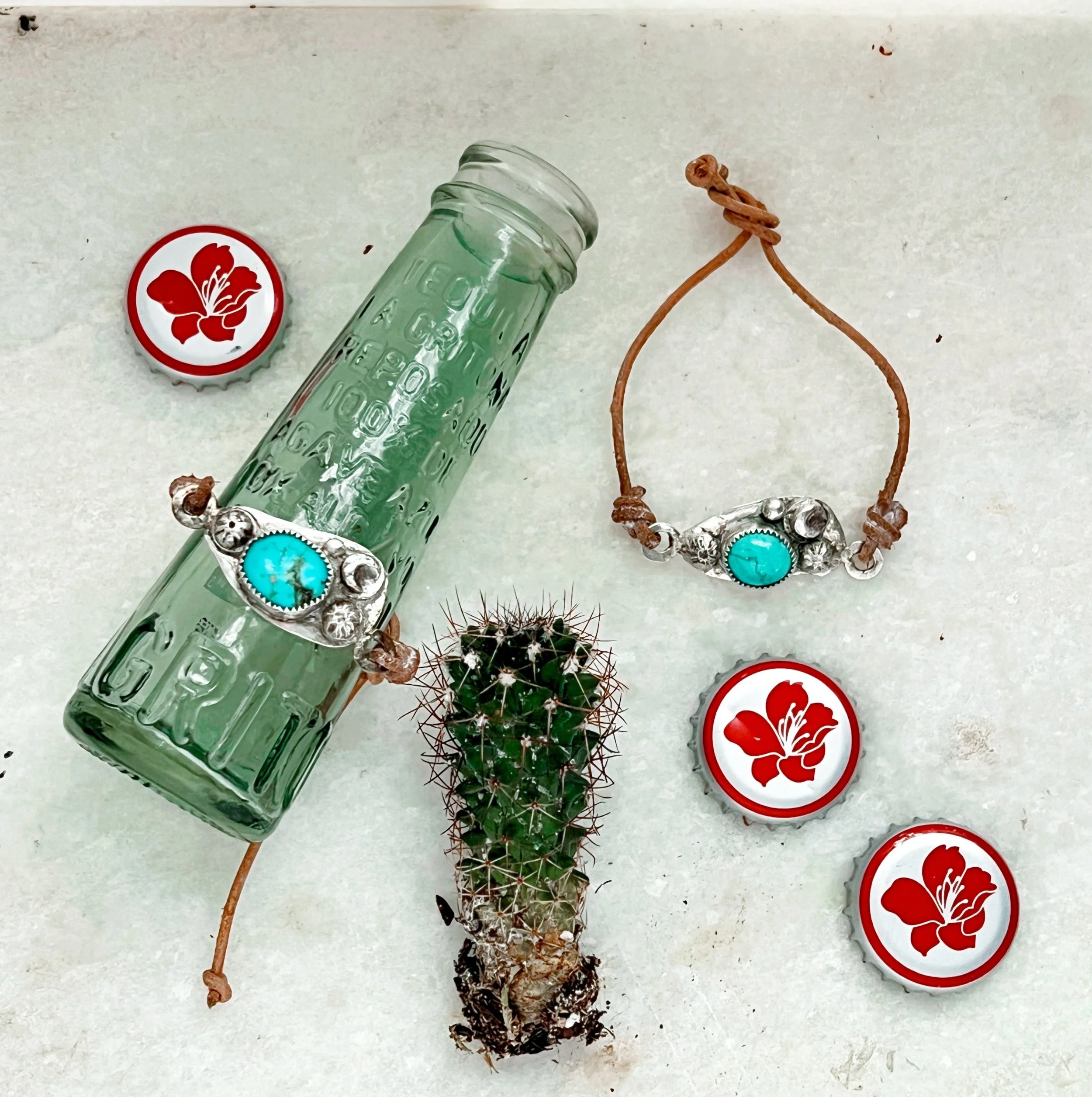 Salt of the Earth, understated yet exquisite. Entirely hand forged using accents and tools created for us by Native Americans. Gorgeous top shelf turquoise + sterling leather wraps. No two are alike, but always special. Talismans. made to never take off.